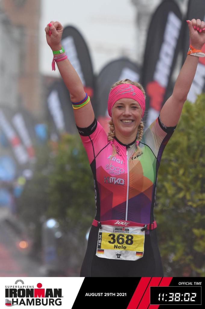 – die letzte Runde war echt hart und jeder Meter fühlte sich an wie ein Kilometer: So langsam spürte ich meine Oberschenkel. Die Traubenzucker von Dextro und das letzte von meinen vier Gels auf der Laufstrecke zwang ich in mich hinein und stopfte noch einmal Tuk-Kekse in mich hinein. Bei dem Bändchen-Stand 200 m vor dem Ziel rief mir eine Dame dann zu: „Komm Nele, noch eine Runde!“ und ich dachte mir so: Leck mich am Arsch! Nur noch 200m!! Ich war wie in einem Trance-Zustand und nahm den Zieleinlauf mit dem pinken Konfetti gar nicht wirklich wahr. Oli schrie mir noch zu: „Achte bei dem Zielfoto darauf, dass du alleine einläufst!“ – und so war es: Niemand direkt vor mir und niemand direkt hinter mir! Ich lächelte und zog die Arme hoch!!! Selbst den Spruch, auf den ich Jahre gewartet hatte: „You are an IRONMAN!“ – bekam ich nicht mit, weil ich immer noch lächelte und alles von mir abfiel!! Ich verspürte Stolz und Schmerz zugleich, verdrückte einige Tränen, als ich meine Liebsten im Ziel in den Arm nahm. Und dann war da die letzte Challenge: Laufe gefühlt 2 km zu deiner Medaille und ziehe dich dann um. Ich konnte noch die Beine heben! Ich war erstaunt: Ich fühlte mich lange nicht so kaputt wie nach einem 24h Fahrrad-Rennen!! …immer war da dieses Gefühl: Nun bist du eine Iron-Women! Und du hast es geschafft- auch ohne vorher jemals eine Mitteldistanz gemacht zu haben! Als ich dann meine Zeit bei der Medaillen-Gravur erfuhr, war ich überglücklich!! Schon beim Abendessen ging mir durch den Kopf, dieses „kranke Abenteuer“ nicht das einzige und letzte mal erlebt zu haben!! Die Pläne gehen weiter und die Träume hören niemals auf! Danke an alle, die mich auf dem Weg zu meiner ersten Langdistanz begleitet haben! Ohne euch wäre das niemals möglich gewesen! Hiermit möchte ich alle Triathleten da draußen daran erinnern, dass ihr alles schaffen könnt, wenn ihr euer Ziel verfolgt! Euer Kopf bringt euch ans Ziel!! Glaubt an euch und hört nicht auf eure Träume wahr werden zu lassen! Sie sind dafür da, in Erfüllung zu gehen! Geht Euren Weg- das kann euch hinterher keiner nehmen! …auch wenn euch einige nach dem ersten IRONMAN als völlig verrückt abstempeln- Egal!