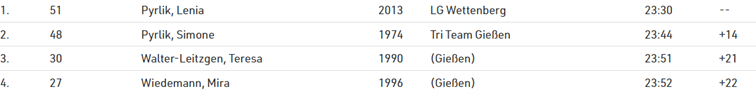 Lenia und Simone starteten innerhalb des Laufes in der offenen Wertung. Beide gewannen ihre AK, Lenia in 22:45min., Simone in 23:34 Minuten.