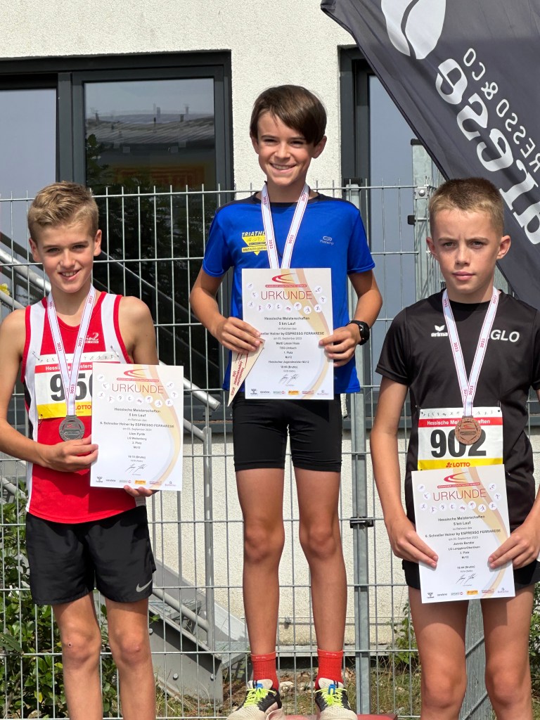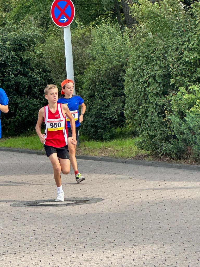Wieder eine Woche später ging es nach Darmstadt, die Hessenmeisterschaften über 5km für Liam und 10km für Claudius standen an. Liam startete in der U12 erstmals bei einem Meisterschaftsrennen und machte das klasse. Er übernahm von Beginn an die Spitze und wurde in 19:10min. nur 4 Sekunden hinter Platz 1 Zweiter. Er erkannte im Ziel selbst, dass eine kraftsparendere Renneinteilung im teilweise „Windschatten“ der Konkurrenz wahrscheinlich zum Sieg geführt hätte. Da war der Erste einfach cleverer. Egal, Liam war happy und es hat Spaß gemacht, das ist das Wichtigste.