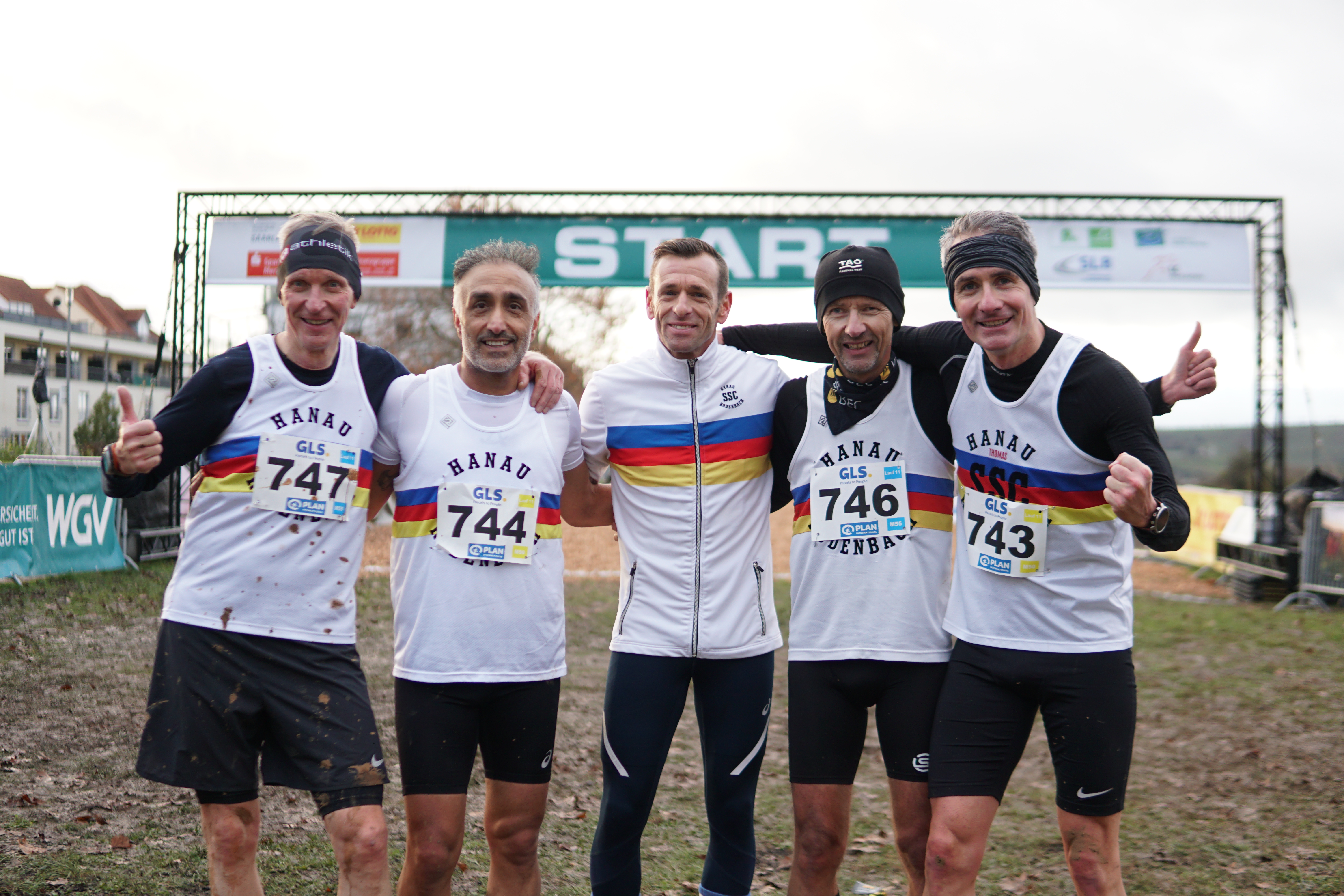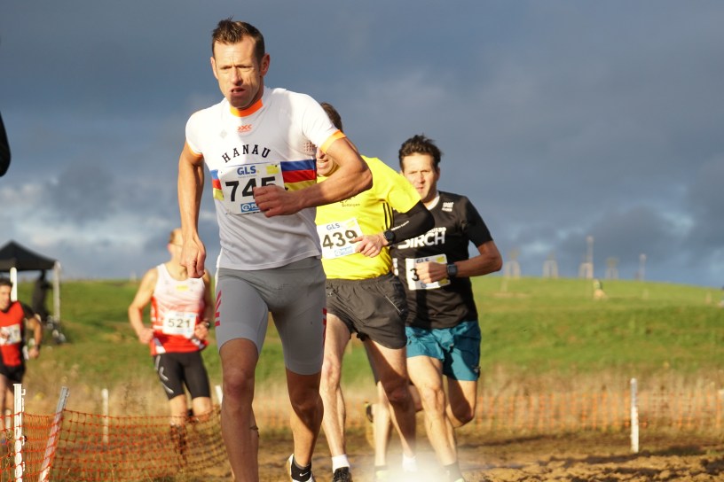 Im September wurde ich bei der DM über 10km Straße in Bad Liebenzell 4., ich hatte alles gegeben und fühlte mich auch richtig gut vorbereitet. Trotzdem waren 3 schneller und der Erste, Seriensieger Markus Mey, nahm mir sogar 58 Sekunden ab. Dieses Ergebnis beschäftigte mich seitdem jeden Tag in jedem Training. Über 10 Wochen versuchte ich leistungsmäßig noch einmal auf ein anderes Niveau zu kommen und bereitete mich gerade die letzten 4 Wochen ganz gezielt auf Cross und die DM vor. Dabei bin ich ganz bewusst viel Risiko im Training eingegangen und mehrfach war mein ganzes „System“ kurz vor dem Kippen. Als ich die Startliste sah war ich beindruckt von der Masse und Klasse in der AK50. Das Markus Mey starten würde und er der „man to beat“ war motivierte mich zusätzlich. In der Wettkampfwoche dann wieder das auf und ab, an einem Tag fühlte ich mich gut, am anderen Tag wieder schlecht, an einem Tag war ich mir sicher alles richtig gemacht zu haben, am anderen Tag wieder die Unsicherheit. Beim warm up direkt vor dem Start wieder dieses Gefühl kraftlos zu sein, an der Startlinie dann nach außen selbstbewusst wirkend, innerlich zweifelnd, ob das Leistungsvermögen ausreicht. Sascha Arndt, unser Teamchef beim SSC Hanau-Rodenbach, redete intensiv auf mich ein, die erste der drei Runden zurückhaltend zu laufen, zu schwer wäre die Strecke. Ich hielt mich daran, nach dem Startschuss war sofort alle Nervosität und Unsicherheit verflogen, ich lief die erste Runde im Pulk ohne Kontakt zur Spitze zu verlieren und fühlte mich gut dabei. Aber mir war klar, wenn ich Erfolg haben wollte, war Mut und Initiative gefragt und daher ging ich am Ende der ersten Runde nach Vorne und drückte bis zum Ziel aufs Tempo. Es war hart, der Untergrund war matschig und tief und die Steigungen taten weh, aber es war immer noch kontrolliert. Mein Vorsprung wuchs auf 60m, 13 Sekunden, und die Leute an der Strecke schrien mich an nicht nachzulassen. Ich gewann und das setzte unglaubliche Gefühle in mir frei, noch nie wurde ich Deutscher Meister im Laufbereich, im Triathlon schon, aber eben nicht bei den Läufern.