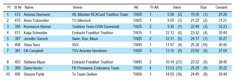 Simone gewann die TW50 und wurde 10. gesamt. Die 16. Schwimm- und 8. Laufzeit führte zu diesem guten Ergebnis.
