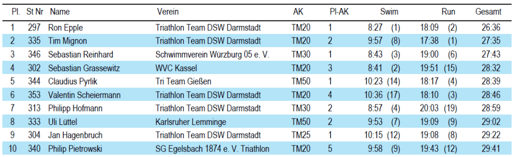 Mit Thomas Förster und Steven Schlömer waren noch zwei weitere Mitglieder des Tri Team Gießen am Start. Thomas gewann in 33.10 Minuten die TM55 und wurde in der Gesamtwertung 26., einen Platz dahinter landete Steven. 33.14 Minuten brachten ihm den 2. Platz in der TM45.