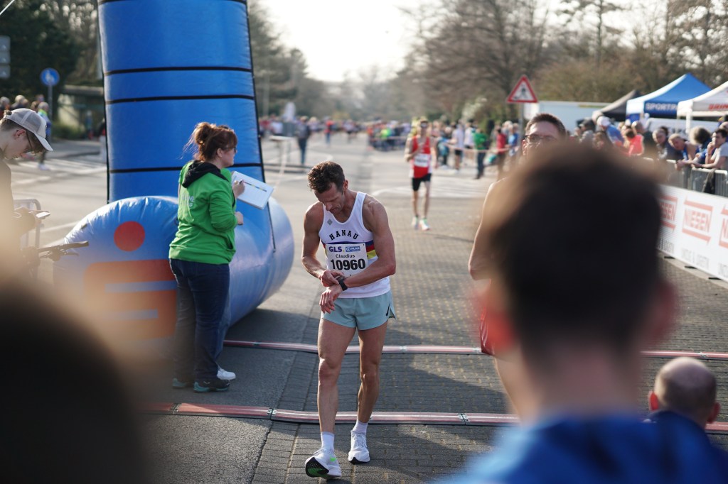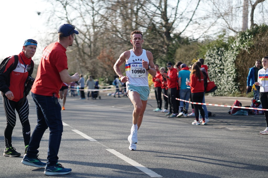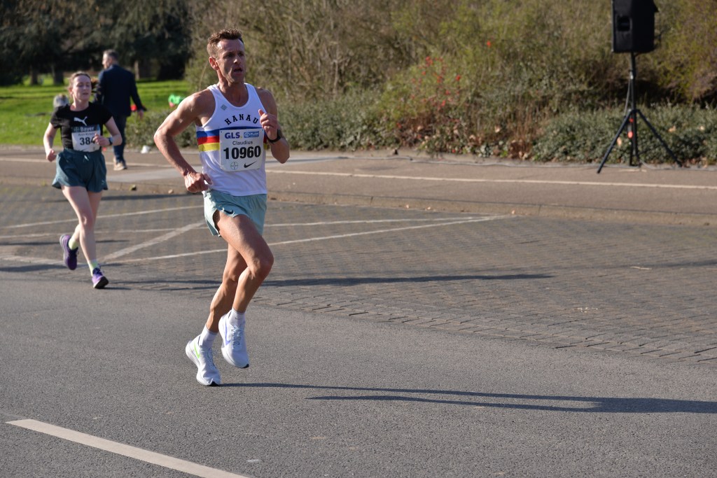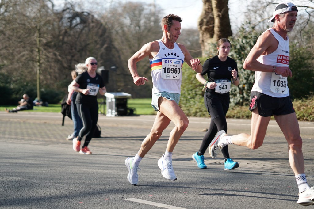 Es hätte nicht besser sein können, 17 Grad – Sonne, und das Anfang März. Perfekt für mich. 4 Runden um den Chempark der Bayer AG Leverkusen waren zu laufen. Vom Start weg machten Jörn Hansen und Markus Mey Druck, ich hängte mich hinten rein. 3:20min. und 3:22min. für die ersten zwei Kilometer waren das, was ich erwartet hatte und fühlten sich OK an. Jörn Hansen lies dann etwas nach und bis KM 6 waren Markus Mey und ich allein an der Spitze. Die ganze Führungsarbeit übernahm dabei der Kölner, wir liefen konstant Kilometersplits von 3:22/3:23min. und mir war es zu riskant nach vorne zu gehen. Seit meinem Wiedereinstieg in den Wettkampfsport bin ich dieses Tempo in einem 10km Rennen nicht mehr gelaufen. Das letzte Mal, dass ich ähnlich schnell unterwegs war, muss im Jahr 2009 gewesen sein. Vor 15 Jahren – oh mein Gott! Bei KM 6 zog Markus das Tempo noch einmal an und schüttelte mich damit ab, ich wurde langsamer und mir war klar, dass jetzt der Stress beginnen würde. Lag ich eben noch klar auf Platz 1 bzw. 2 würden jetzt die anderen Läufer wieder aufschließen, so kam es auch. Jörn Hansen war kurz vor KM 8 wieder an mir dran und schnell vorbei und kurz nach ihm folgte Tim Gollisch (LG Göttingen) den ich ehrlich gesagt überhaupt nicht auf der Rechnung hatte. Ohne mich umzudrehen, hörte ich, dass eine weitere Gruppe dicht hinter mir war. Da war ich also wieder auf dem verhassten Platz 4 und es war noch nicht einmal sicher, ob ich den überhaupt halten kann.
