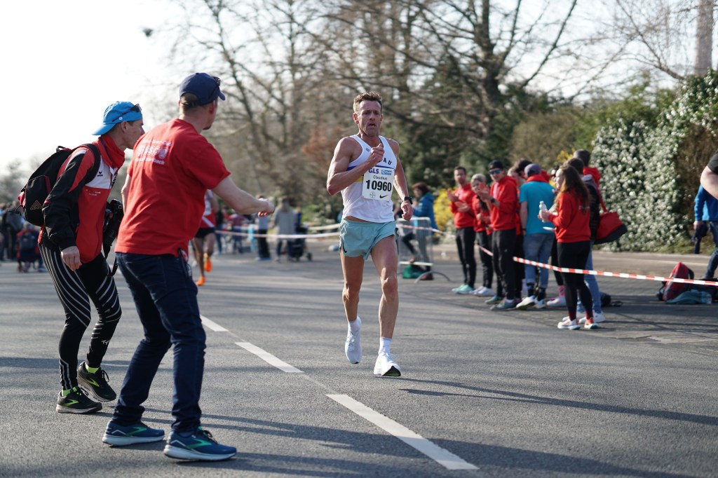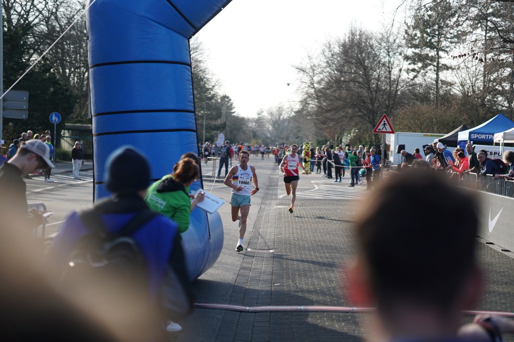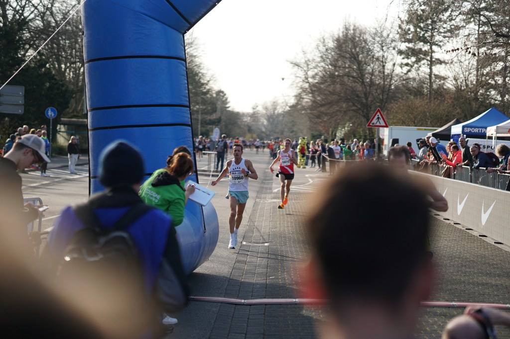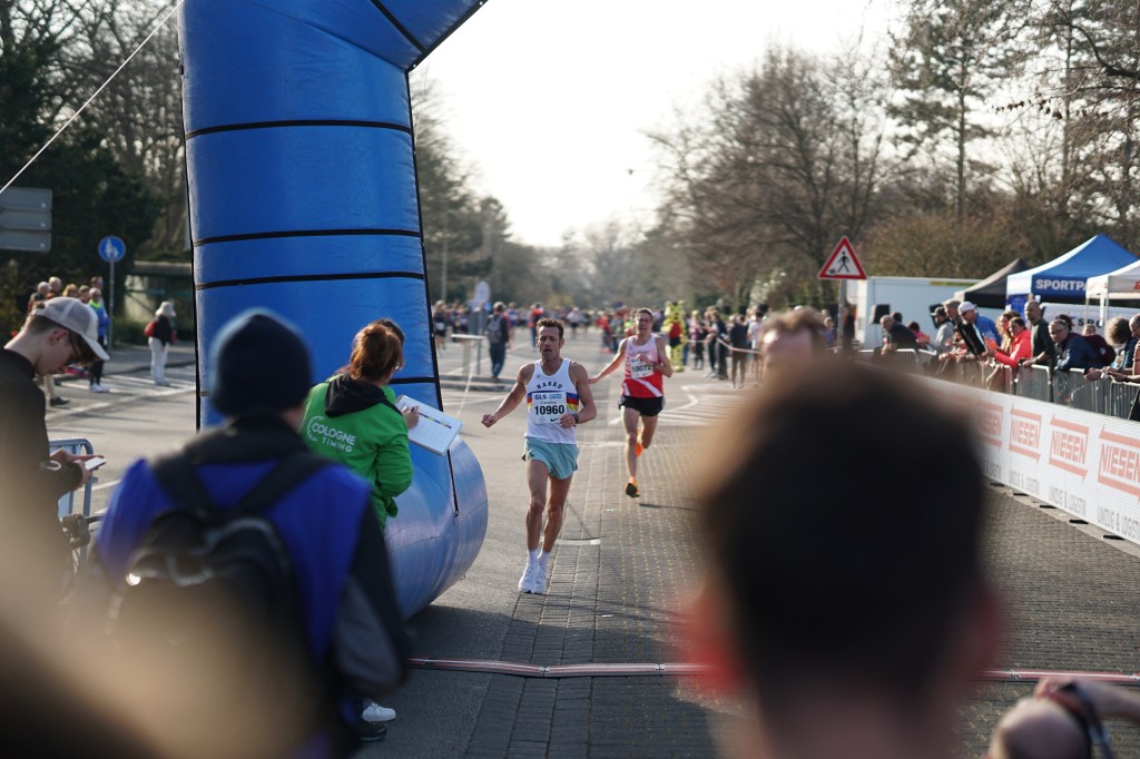 Ich war aber genau auf so ein Szenario vorbereitet, blieb bis KM 9 an Jörn Hansen dran, Tim Gollisch war bereits 150m von uns weggelaufen, und zog dann an, um mich auf dem letzten Kilometer maximal auszuquetschen. Hansen konnte nicht mitgehen, verlor aber nicht den Abschluss, und auf Gollisch machte ich Boden gut. Der wurde aber, genau wie ich, von seinen Leuten angebrüllt und wir sprinteten die letzten 300m, als wären wir gerade erst losgelaufen. Es fühlte sich an, als würde mein ganzer Körper einfach auseinanderfallen. Ich kam zwar bis auf 2 Sekunden heran, aber nicht mehr vorbei, aber – und das war das Wichtigste – Platz 3 war gerettet. 1 Sekunde vor Platz 4, 6 Sekunden vor Platz 5.
