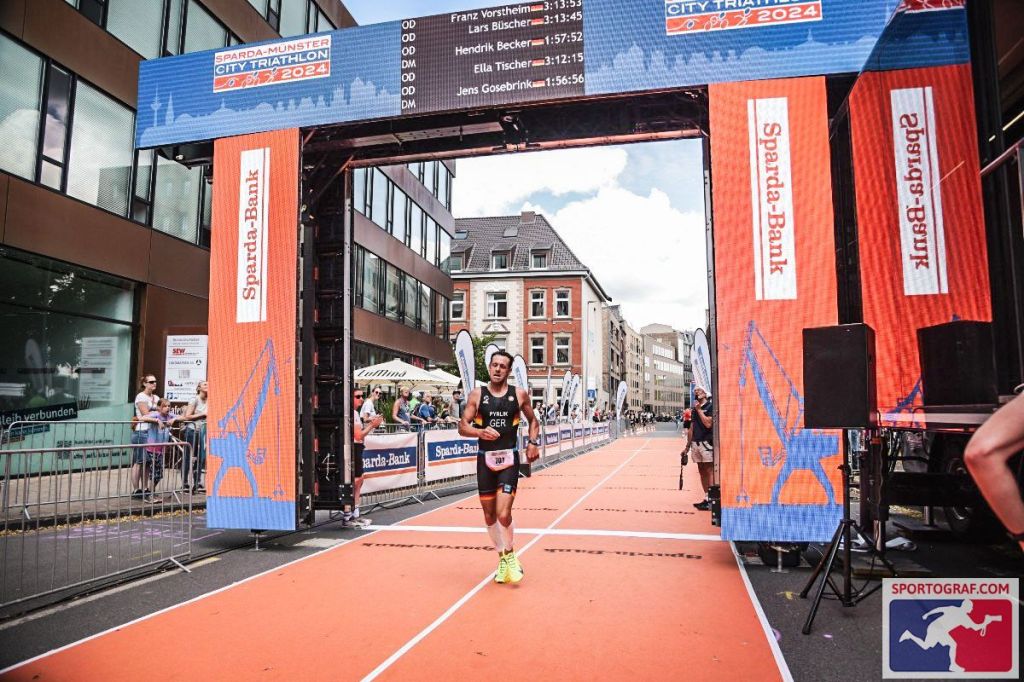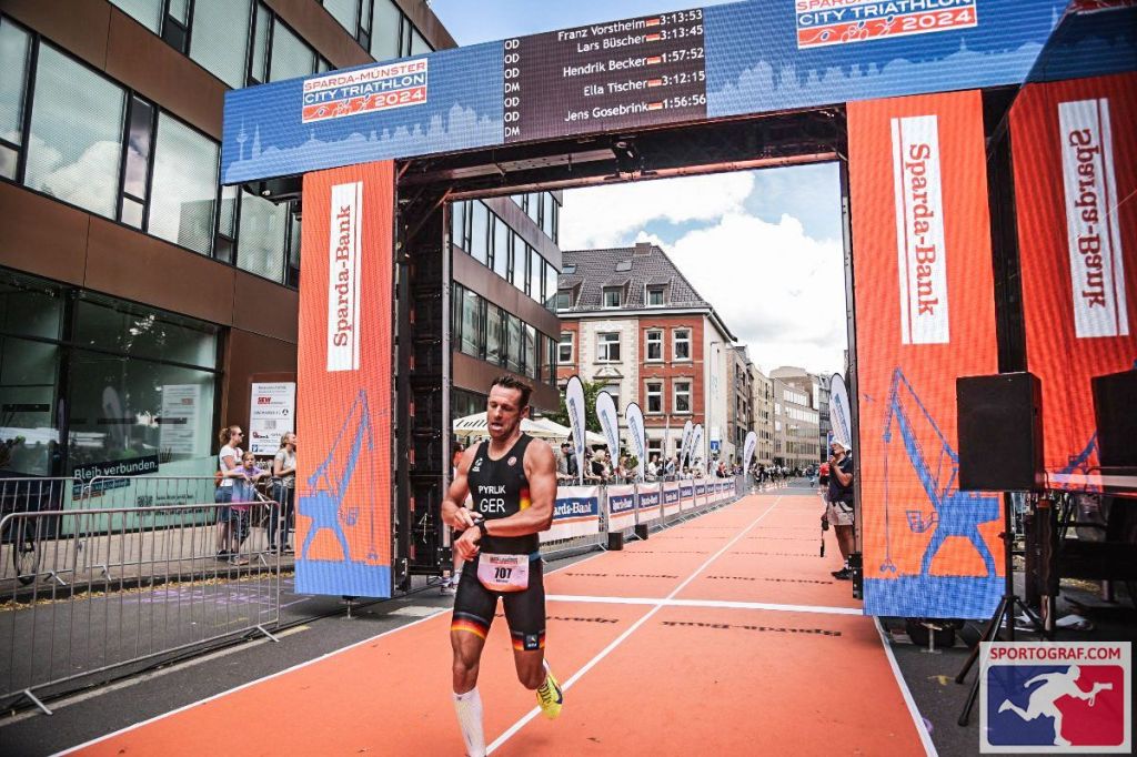 Bei, endlich, sommerlichen Bedingungen fand gestern im Rahmen des Sparda Münster City Triathlon die Deutsche Meisterschaft über die Olympische Distanz (1,5km/40km/10km) statt. Alle DM-Teilnehmer starten dabei zusammen in einem Massenstart, am Ende erfolgt eine Vergabe der Titel gemäß der entsprechenden Altersklasse. Es ist also empfehlenswert im Vorfeld Startnummern und Namen seiner Konkurrenz zu kennen, um sich dann im Wettkampf orientieren zu können. In meinem Fall war das einfach, „ich brauche immer den Abstand zur Nr. 712 – Matthias Heineke“ so die Info an meine Kinder am Streckenrand. Der Hamburger kommt, overall, immer ganz vorne aus dem Wasser. Meist hatte er 2 Minuten und mehr Vorsprung auf mich und im Rennverlauf konnte ich bisher zwar immer aufholen, es reichte aber noch nie, um ihn zu schlagen und vor ihm ins Ziel zu laufen. Ich hatte mir fest vorgenommen das in diesem Jahr zu ändern. Aus gutem Grund. Meine Schwimmform ist rechtzeitig wieder auf dem Niveau wie vor meinem Ellenbogenbruch. Auf dem Rad bin ich dank Trainingsumstellung so gut wie seit meinem Wiedereinstieg nicht mehr und beim Laufen liegt immer noch meine Stärke. Ich habe und hatte aber einen riesigen Respekt vor Matthias, er liefert immer ab und ist durch seine Schwimmstärke von Beginn an in einer besseren Position im Rennen als ich.