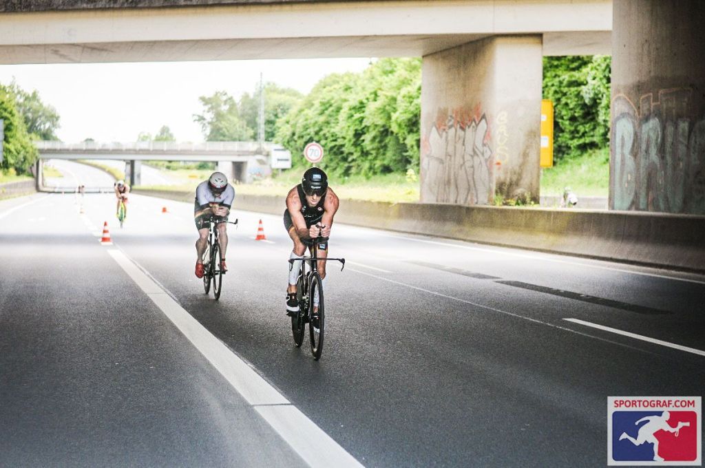 Beim Schwimmen in Münster im Hafenbecken war der Neoprenanzug erlaubt, ich musste derart hart arbeiten, dass es mir regelrecht heiß im Neo wurde und ich froh war den Anzug in der Wechselzone wieder loszuwerden. Die Anstrengung hatte sich aber gelohnt, es waren statt der 2 Minuten nur 1:40min. Rückstand auf Matthias Heineke. Bis auf 30 Sekunden schloss ich diese Lücke auf der Radstrecke. Die erste Runde fuhr ich im Schnitt von 41.4km/h, merkte dass das noch nicht ausreichend schnell war und erhöhte das Tempo in der zweiten Runde auf 42.8km/h (im Schnitt).