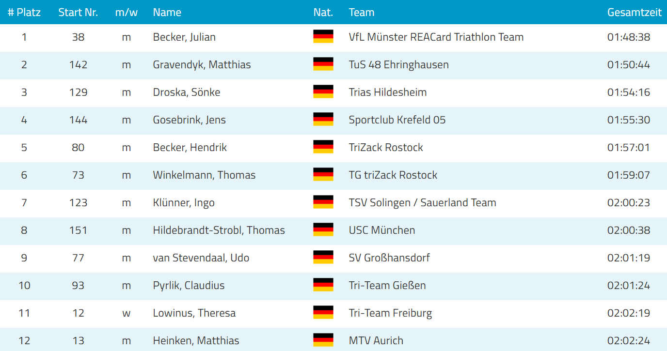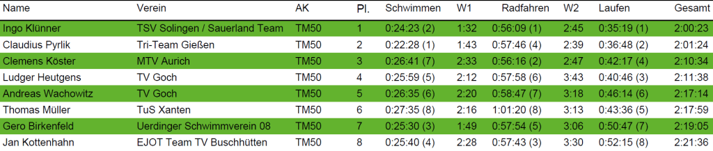 Beim Laufen reichte es dann nur noch für die 10. Laufzeit gesamt und zweitschnellste in der AK. Der neue Deutsche Meister, Ingo Klünner vom TSV Solingen lief fast 90 Sekunden schneller als ich, er überholte mich direkt nach der zweiten Wechselzone und ich hatte keine Chance dranzubleiben. Und – NEIN! Alles, was ich oben zur Entwicklung auf der Radstrecke geschrieben habe, bedeutet nicht, dass er deswegen gewonnen hat. Er hat gewonnen, weil er besser war und ein anderer Rennverlauf hätte sicher den Abstand zwischen uns klar verringert, er war aber der Stärkere und hat verdient gewonnen. Sein Vorsprung im Ziel lag bei 1 Minute auf mich als Zweitem, mein Vorsprung auf Platz drei lag bei 9 Minuten.