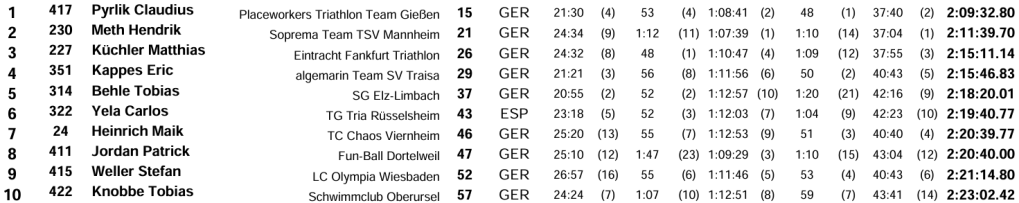 Am Sonntag wurde dann die Olympische Distanz (1.500m/40km/10km) ausgetragen. Neben der Gesamtwertung aller rund 400 Starterinnen und Startern gab es auch die Wertung der Mastersliga innerhalb derer ich für meinen Verein Tri-Team-Gießen an den Start ging. Nach den überwiegend flachen Radstrecken der Wettkämpfe dieser Saison freute ich mich regelrecht auf die bekannt selektive Streckenführung in Viernheim. Dadurch entfallen ganz natürlich die Diskussionen im Ziel über unfaire Rennverläufe. Geschwommen wurde, ohne Neopren, im Wiesensee Hembsbach. Von dort ging es mit dem Rad von 85 m Höhe auf die Juhöhe (390 m). Danach war das Feld vor sortiert. Obwohl mein Wattmesser mir in tiefroter Farbe anzeigte, dass das jetzt doch zu hart ist, kam ich richtig gut den Anstieg hoch und setzte mich an die Spitze der Mastersliga und der AK50. Im weiteren Verlauf der Strecke kamen noch zwei weitere, nennenswerte Anstiege bevor wir bei KM 20 durch den Saukopftunnel fuhren. Dieser unterquert nördlich von Weinheim den Westkamm des Odenwaldes und ist 2715 m lang. Anschließend ging es nur noch flach zur 2. Wechselzone im Viernheimer Stadion. Auf den abschließenden 10 Lauf Kilometern lief ich deutlich schneller als die Konkurrenz und gewann sowohl die Mastersliga als auch die AK50 in der Gesamtwertung.