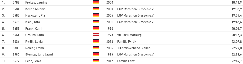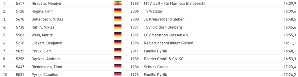 Der Lauf erfreute sich noch höherer Anmeldezahlen als im Vorjahr, was die Folge hatte, dass es sehr früh zu Überrundungen kam. Da viele der Läuferinnen und Läufer gerne im Team nebeneinander laufen, kam es an der ein oder anderen Stelle zu äußerst schwierigen Überholmanövern, mit den entsprechenden Auswirkungen auf die Laufzeiten. Da der leistungssportliche Ansatz beim Gießener Stadtlauf nicht im Vordergrund steht, sondern der Spendenerlös, wird und kann das auch selbstverständlich in den kommenden Jahren so bleiben. Trotzdem darf über ein Splitting des Teilnehmerfeldes auf zwei 5km Starts nachgedacht werden, das würde es für alle Läuferinnen und Läufer angenehmer und noch höhere Anmeldezahlen möglich machen.